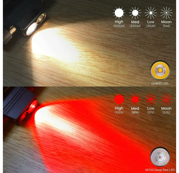 Завдяки іменитому світлодіоду від Samsung (LH351D 5000K 1100Lm) – ліхтар має високу CRI, що створює високий комфорт для роботи на близькій та середній дистанції. Перевірений часом на SST 20 DR з яскравістю до 660 Lm забезпечить вас яскравим, червоним світлом. Ліхтар заряджається через прихований type-C розʼєм на корпусі.