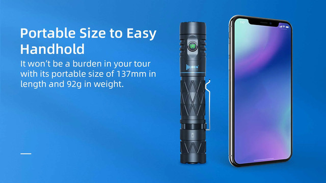 - Компактні розміри та мала вага, завдяки чому ліхтар зручний у транспортуванні. Він навіть менший за стандартний безрамковий смартфон.