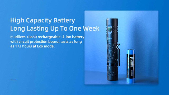 Живлення здійснюється від змінного фірмового Li-Ion акумулятора типу 18650 ємністю 3100 mAh (в комплекті), який заряджається безпосередньо в ліхтарі через роз'єм Type-C.