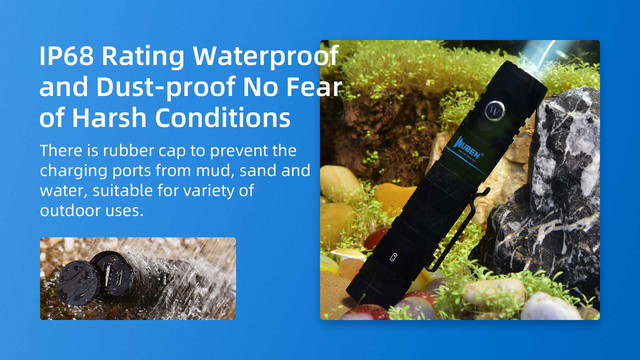 Корпус ліхтаря виготовлений із міцного та надійного матеріалу, що забезпечує стійкість до суворих умов. Для захисту портів зарядки від бруду, піску та води передбачений гумовий ковпачок.