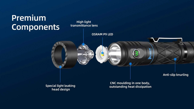 Оснащений світлодіодом OSRAM P9 LED, що забезпечує дальність освітлення до 179 метрів.