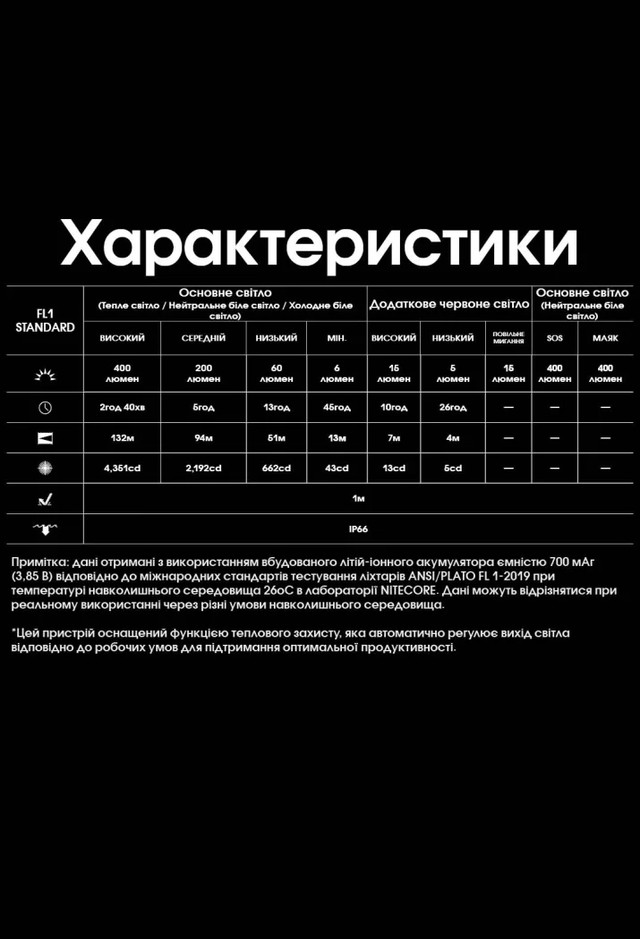 | Особливості ліхтаря | Пилостійкий, Регульований кут нахилу, Вбудований акумулятор, Індикатор заряду, Вологостійкий, Протиударний, Нічний режим, Захист від перегріву, Червоне підсвічування |