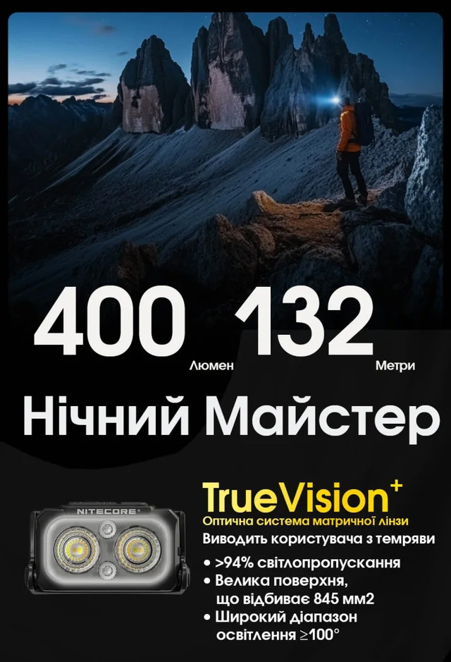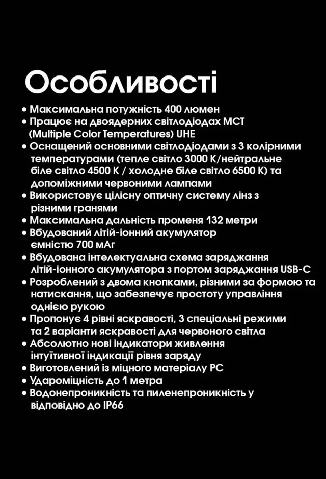 - 400 люменів максимальної яскравості, до 132 м освітлення