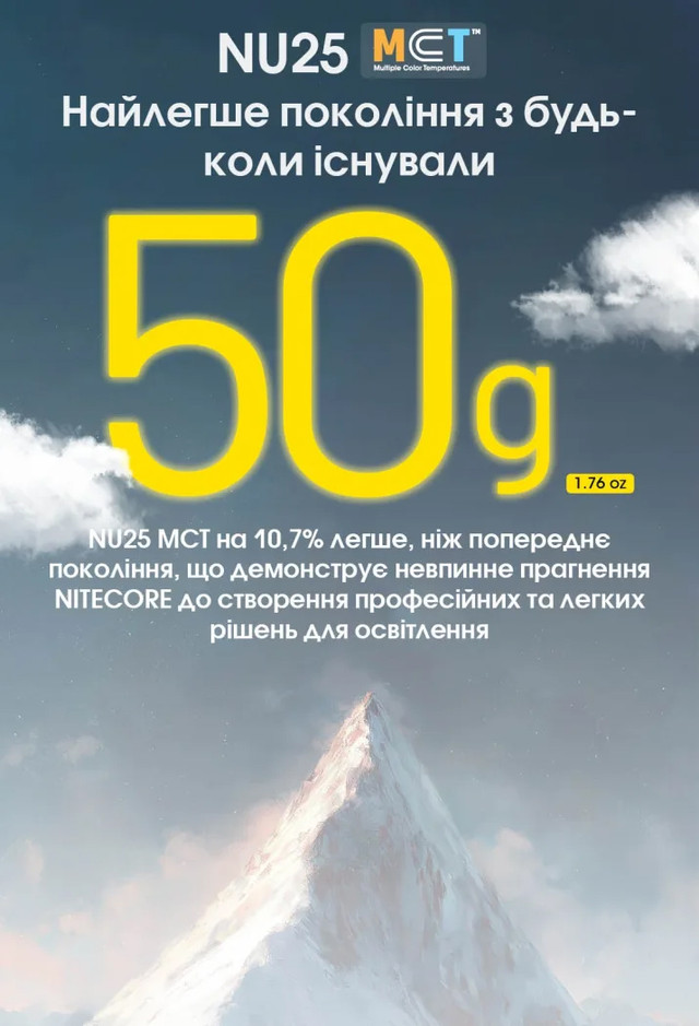 Nitecore NU25 MCT — це нове покоління популярної серії NU25, створене для тих, хто шукає баланс між максимальною функціональністю та мінімальною вагою. Ліхтар оснащений комбінованою системою освітлення, що дозволяє обрати ідеальне світло для будь-яких умов — від спорту до кемпінгу чи роботи на природі.