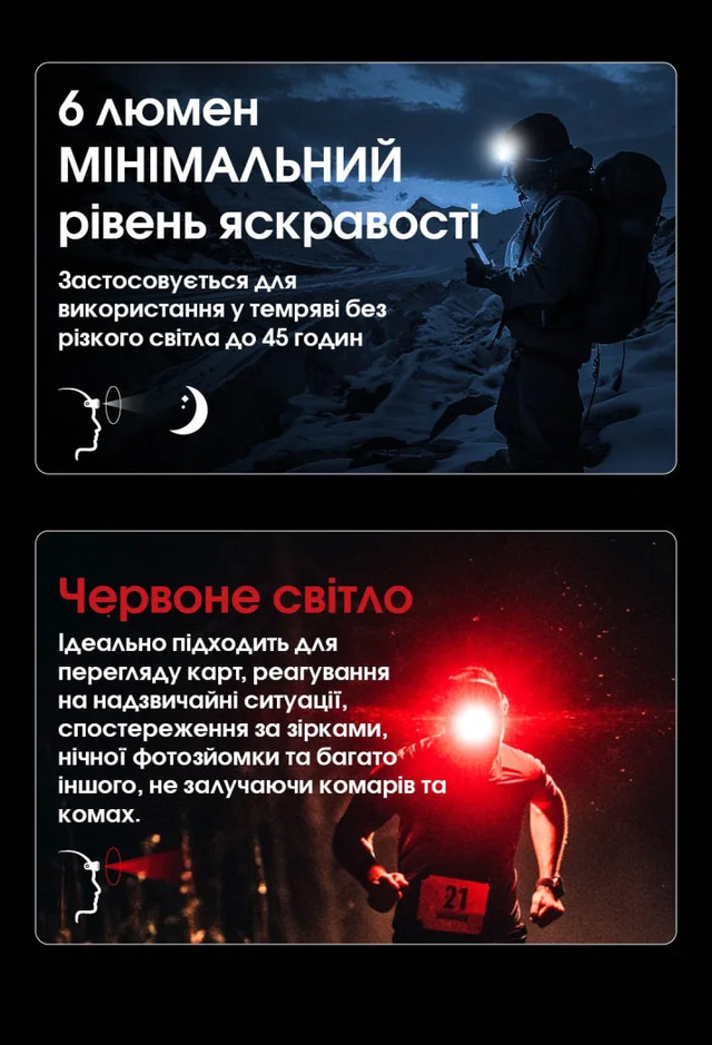- Тип: налобний ліхтар / EDC / для бігу / туристичний